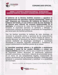 COMUNICADO OFICIAL – ARRIBA A JUCHITÁN EL OPERATIVO ESPECIAL “ISTMO EN PAZ”; GOBIERNO MUNICIPAL RECONOCE COORDINACIÓN INTERINSTITUCIONAL