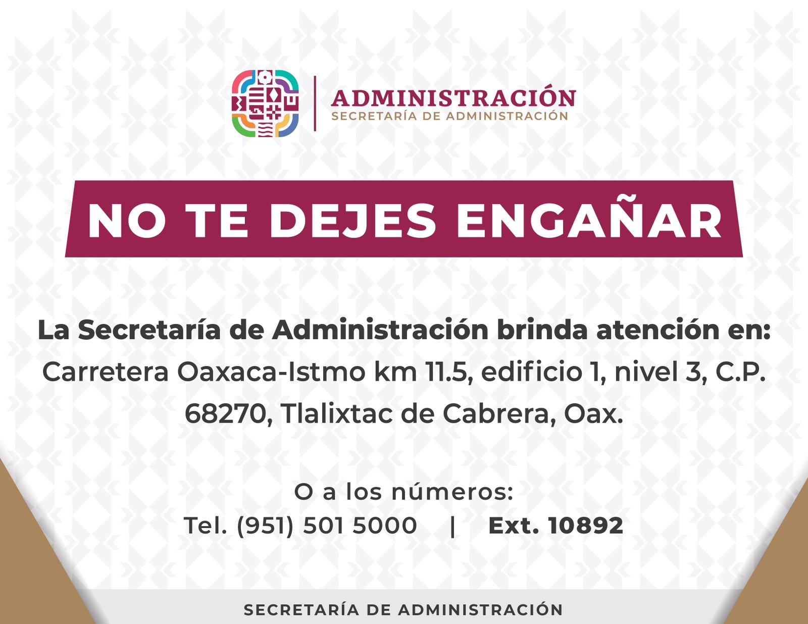 La Secretaría de Administración del Gobierno de Oaxaca informa a la ciudadanía que la única fuente oficial de información directa y atención al público se encuentra en las oficinas de esta dependencia ubicadas en Ciudad Administrativa Benemérito de las Américas, edificio 1, piso 3, Carretera Oaxaca-Istmo Kilómetro 11.5, Tlalixtac de Cabrera, Oaxaca.