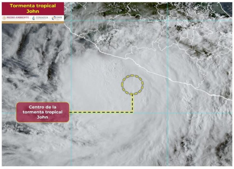 La tormenta tropical “John” incrementa la velocidad del viento cerca de la costa de Guerrero; a las 18:00 horas de este miércoles se localizó a 90 kilómetros (km) al sur-suroeste de Zihuatanejo, Guerrero y a 145 km al sureste de Lázaro Cárdenas, Michoacán.