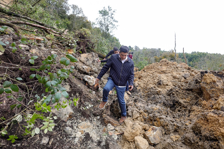 San Ildefonso Villa Alta. Oax. 24 de octubre de 2024.- Luego de cruzar a pie los derrumbes causados por las intensas lluvias que dejó la tormenta tropical Nadine, el Gobernador de Oaxaca Salomón Jara Cruz arribó a este municipio de la Sierra de Juárez para evaluar las afectaciones, atender a las autoridades y apoyar a las familias oaxaqueñas.