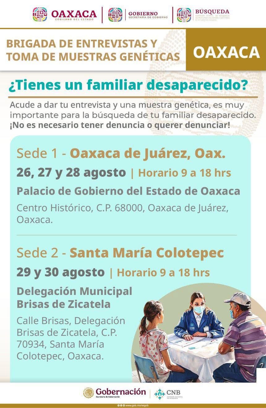 Oaxaca de Juárez, Oax. 20 de agosto de 2025.- La Comisión Estatal de Búsqueda de Personas Desaparecidas (CLB Oaxaca) invita a las y los ciudadanos que tenga un familiar desaparecido, a participar en la Primera Brigada de Entrevistas y Toma de Muestras Genéticas en Oaxaca, con el objetivo de fortalecer las acciones de rastreo e identificación.