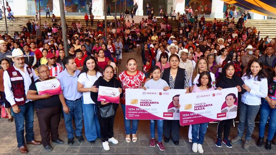 Entrega Primavera Oaxaqueña tarjetas Margarita Maza y Farmacias Bienestar en la Sierra de Flores Magón