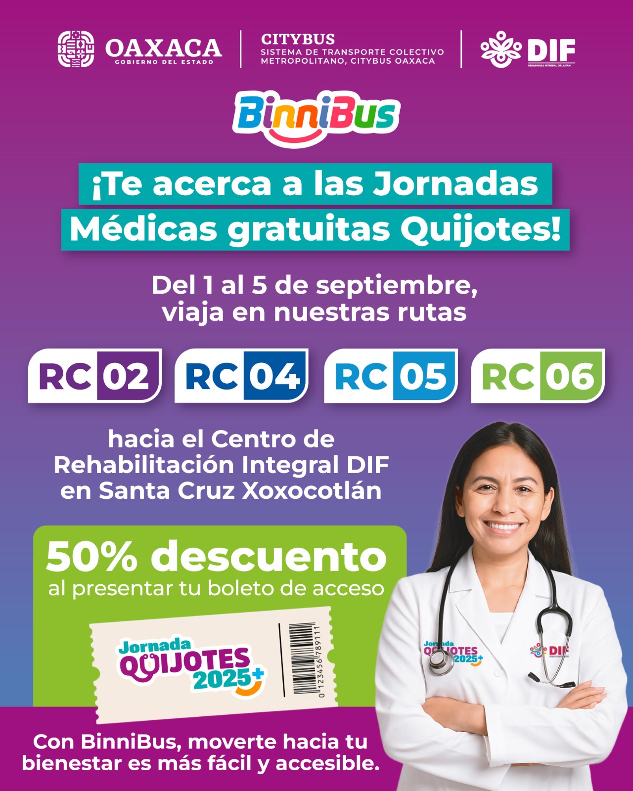 Brinda BinniBus Oaxaca 50% de descuento a personas usuarias de las Jornadas Médicas Gratuitas “Quijotes”