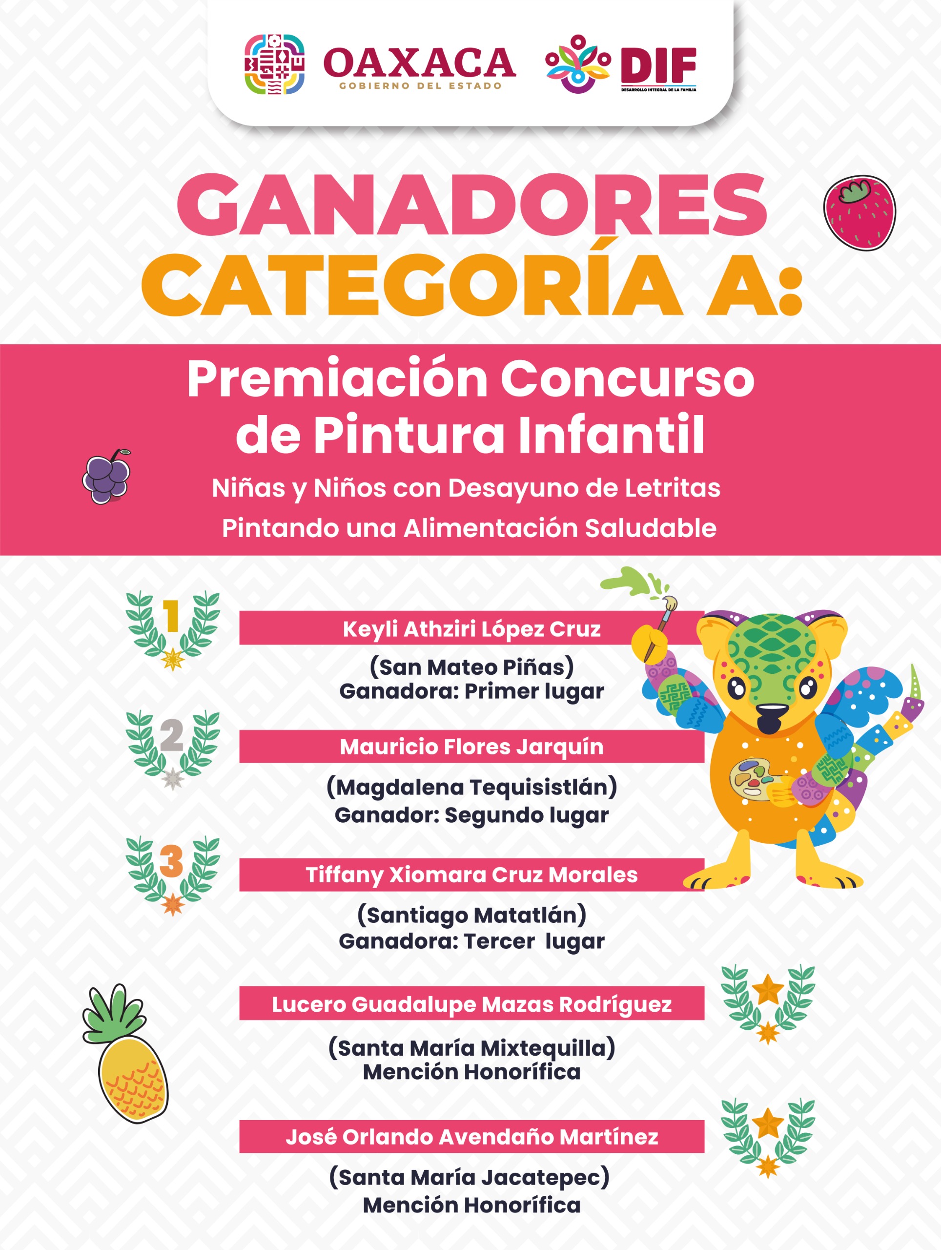 El certamen realizado a través de la Dirección de Operación de Asistencia Alimentaria informa que, en la categoría A, el primer lugar lo obtuvo Keyli Athziri López Cruz, originaria de San Mateo Piñas; el segundo Mauricio Flores Jarquín, de Magdalena Tequisistlán; y el tercero Tiffany Xiomara Cruz Morales, de Santiago Matatlán.