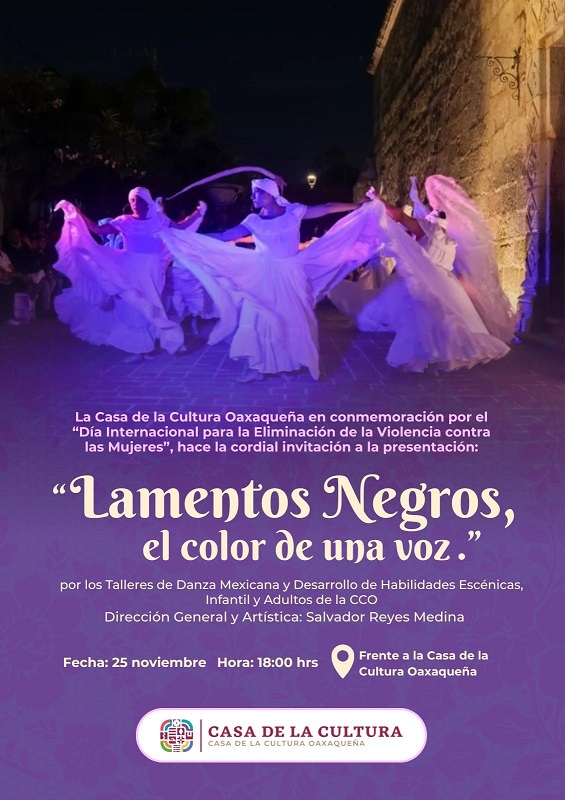 El 25 de noviembre, a partir de las 18:00 horas, se presentará la puesta en escena “Lamentos negros, el color de una voz” en conmemoración del Día Internacional para la Eliminación de la Violencia contra las Mujeres, a cargo del Taller de Danza Mexicana y Desarrollo de Habilidades Escénicas Infantil y de Adultos, bajo la dirección de Salvador Reyes Medina.