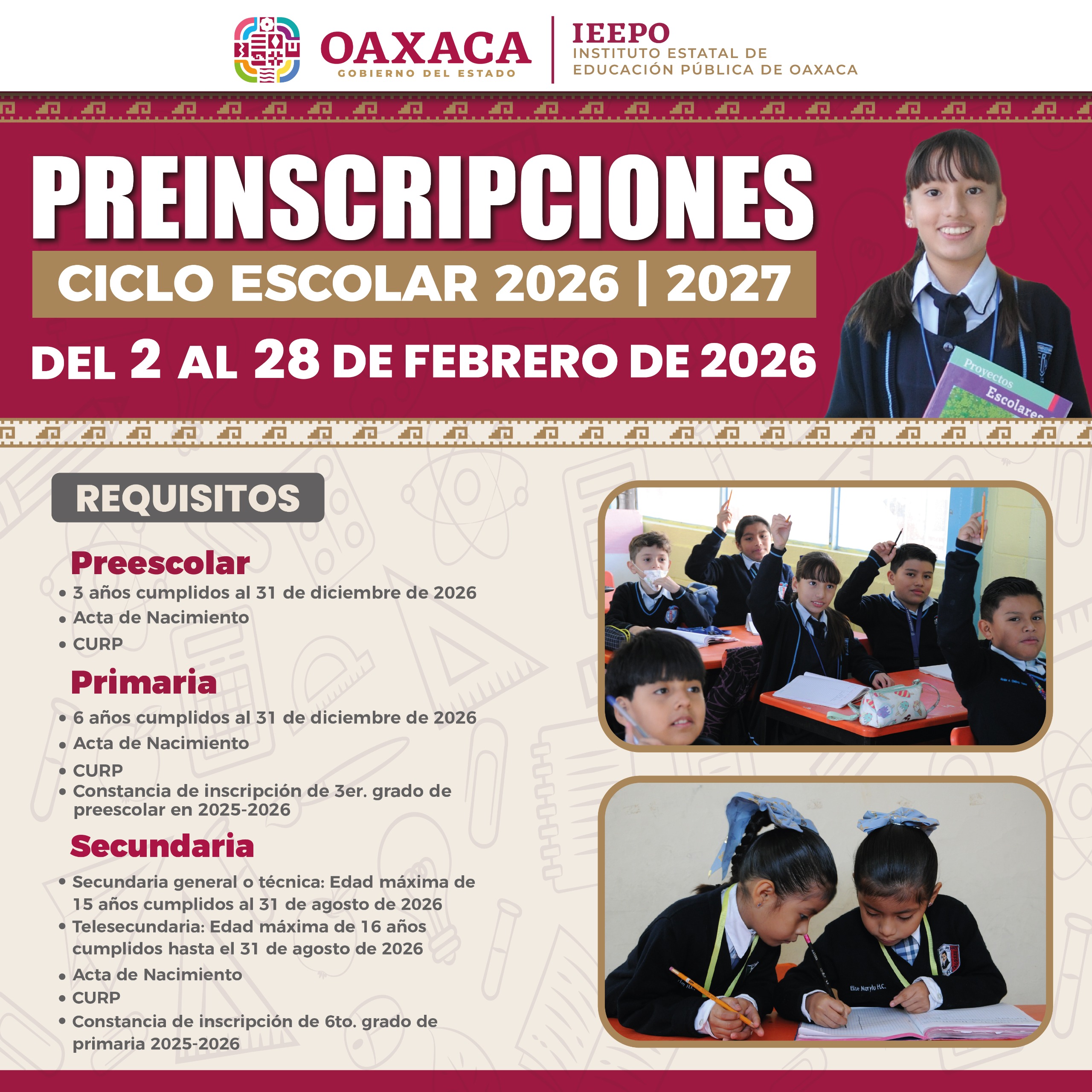 Preinscripciones de educación básica para ciclo escolar 2026-2027 serán del 2 al 28 de febrero: IEEPO