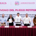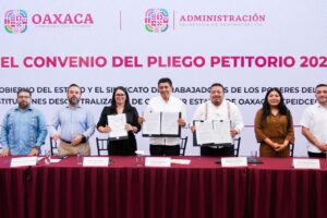 Junto al Gobernador Salomón Jara Cruz, la Presidenta Honoraria del organismo estatal, Irma Bolaños Quijano…